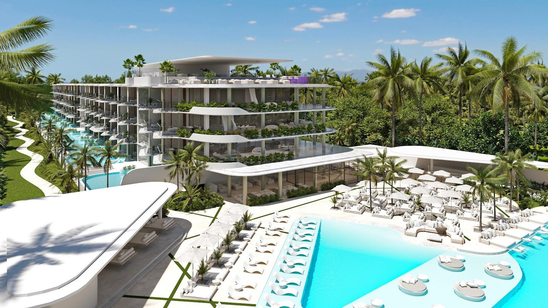 a white building with palm trees